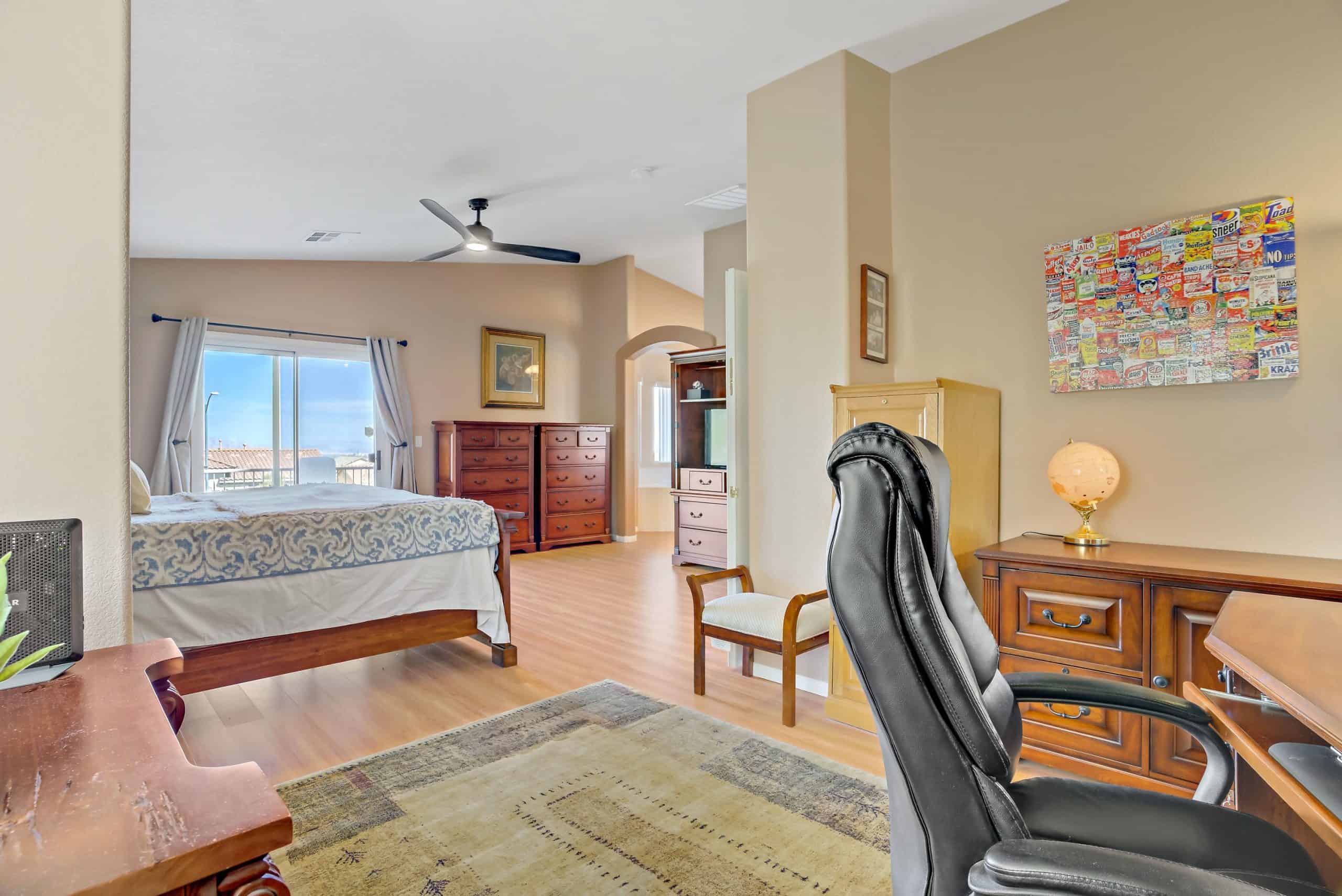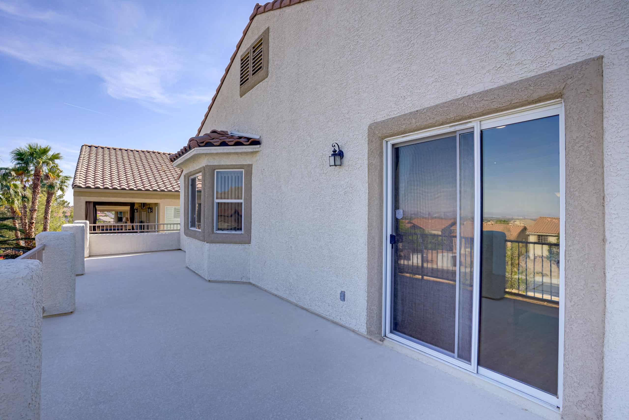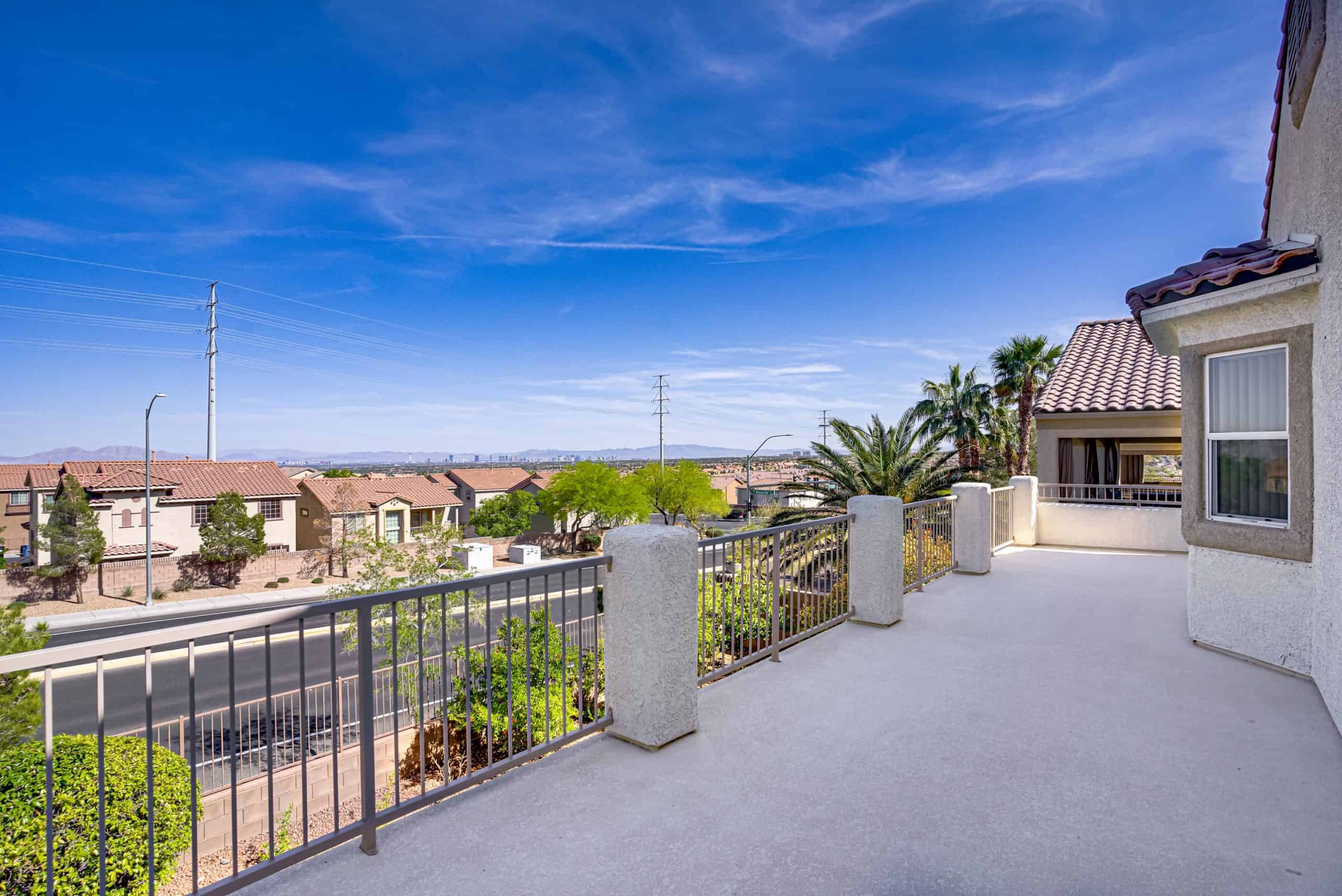 The highlight of the home is the full-length balcony offering unobstructed, panoramic views of the Las Vegas Strip—perfect for sunrise coffees, sunset cocktails, and front-row seats to firework shows. The backyard is a true oasis with a covered patio, real grass (with potential rebate opportunities), and fruit-bearing trees including lemons, apricots, peaches, and pomegranates.