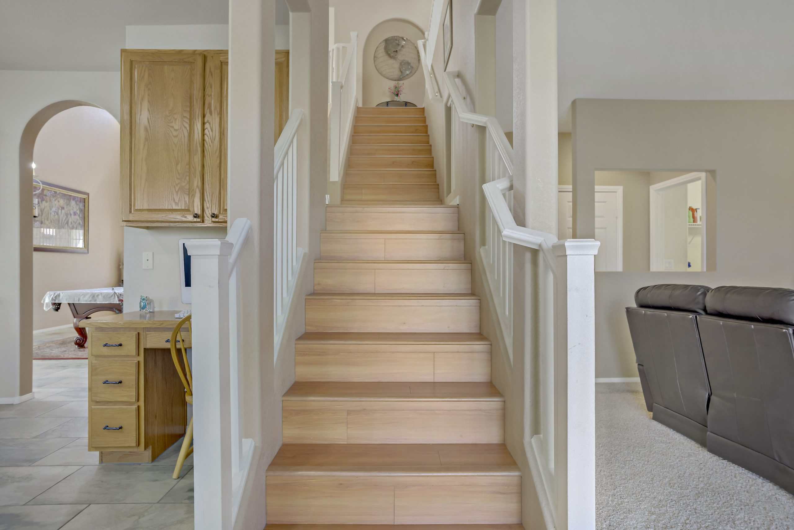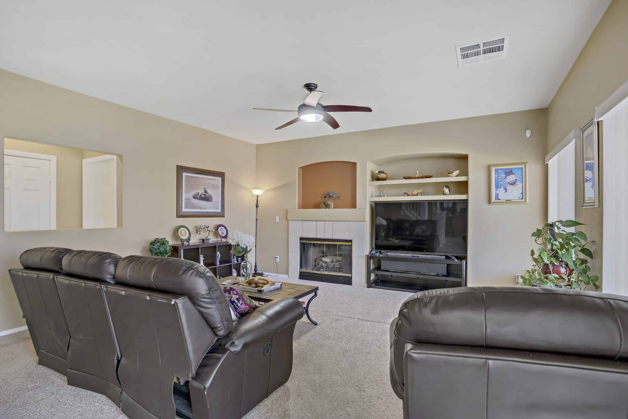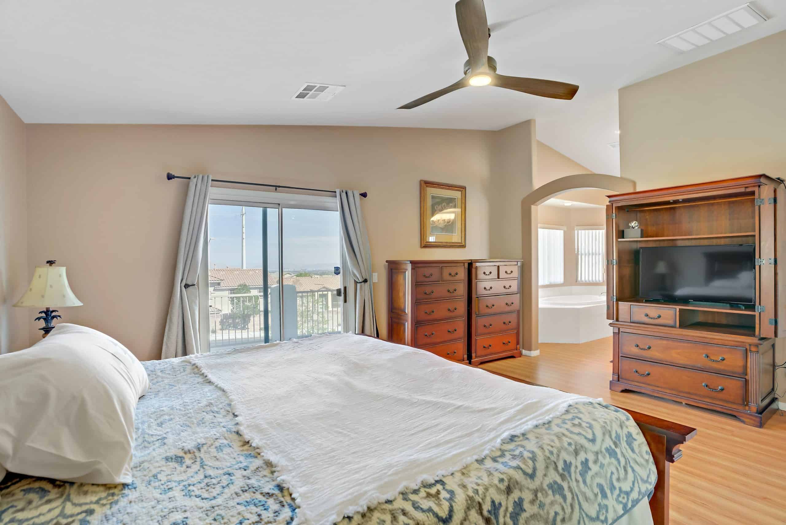 The highlight of the home is the full-length balcony offering unobstructed, panoramic views of the Las Vegas Strip—perfect for sunrise coffees, sunset cocktails, and front-row seats to firework shows. The backyard is a true oasis with a covered patio, real grass (with potential rebate opportunities), and fruit-bearing trees including lemons, apricots, peaches, and pomegranates.