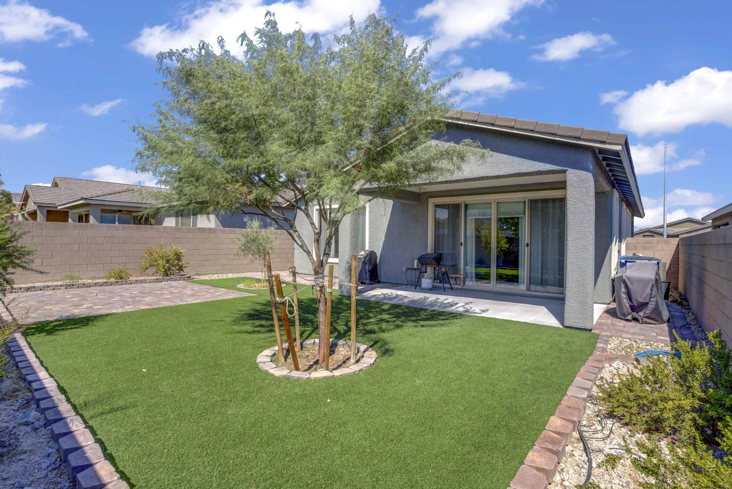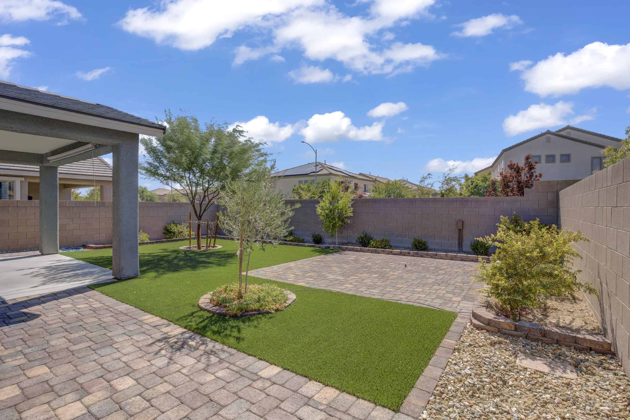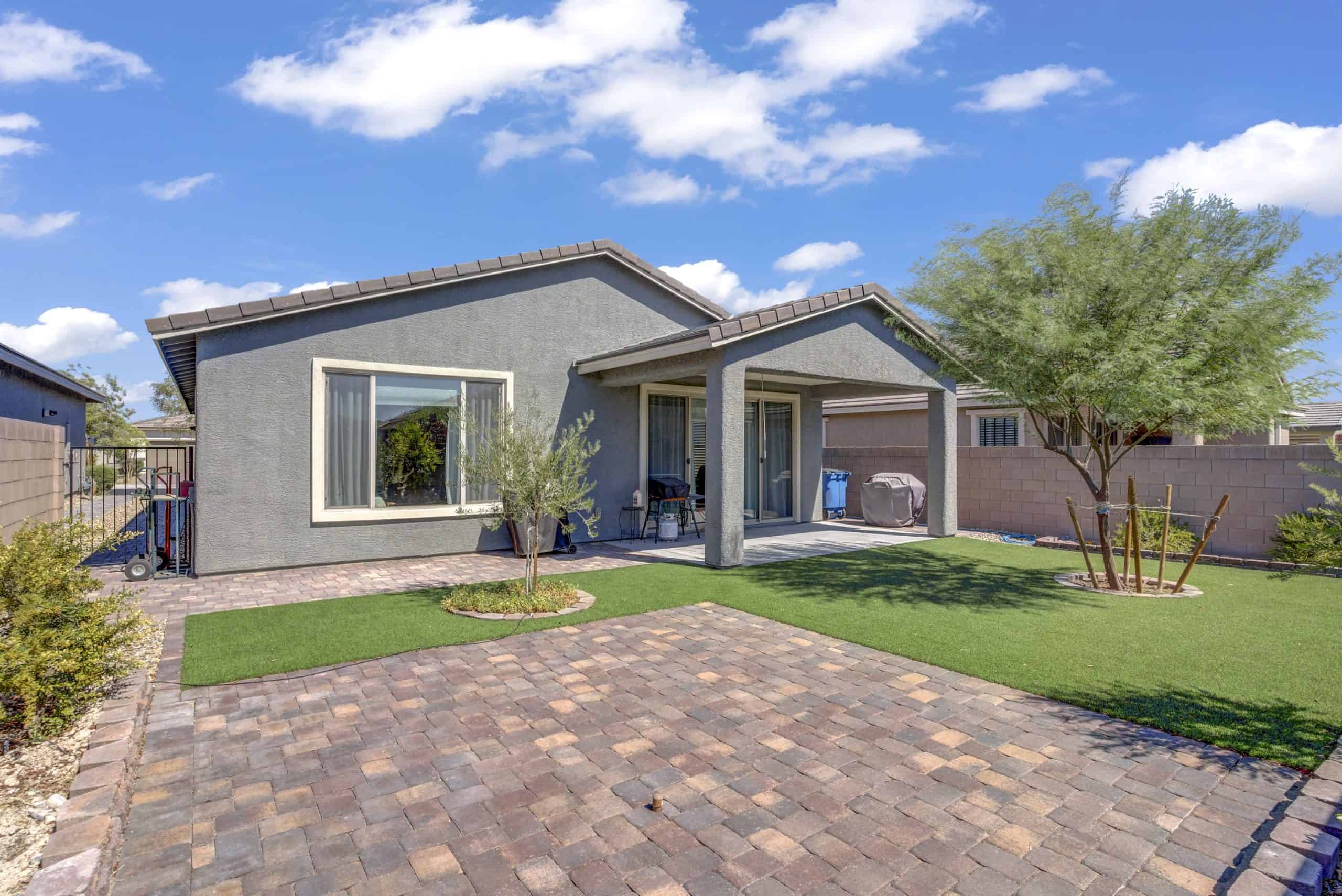 The primary suite boasts a spacious walk-in shower with a seat, dual vanity, walk-in closet, and serene backyard views. Outdoors, enjoy a landscaped, low-maintenance yard with electrical to the paver patio for a hot tub, a covered patio with retractable shade, and no neighbors behind.