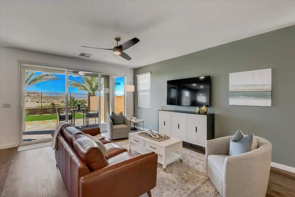 One of my favorite areas to relax in is in the lovely backyard in the hot tub to soak in the surrounding nature views, then I would say the dining room that overlooks the Las Vegas strip with an elegant marble high top table. The living room is open to kitchen and dining so that you can cook and chat. A new mounted new 65” Smart TV in the living room which is the perfect space to wind down and relax after a long day. This is a 3 bedroom home with a loft and all bedrooms are upstairs and it’s never been lived in. You could be the first lucky one!